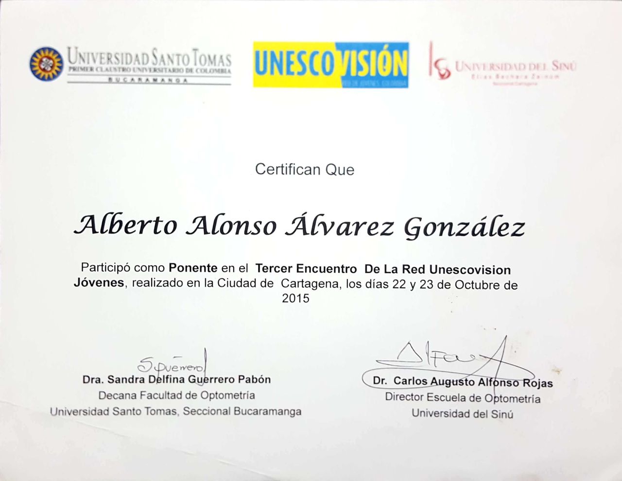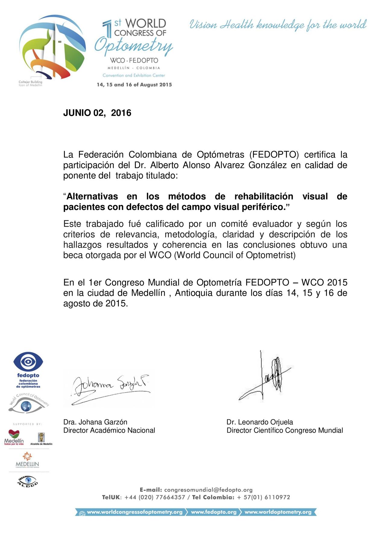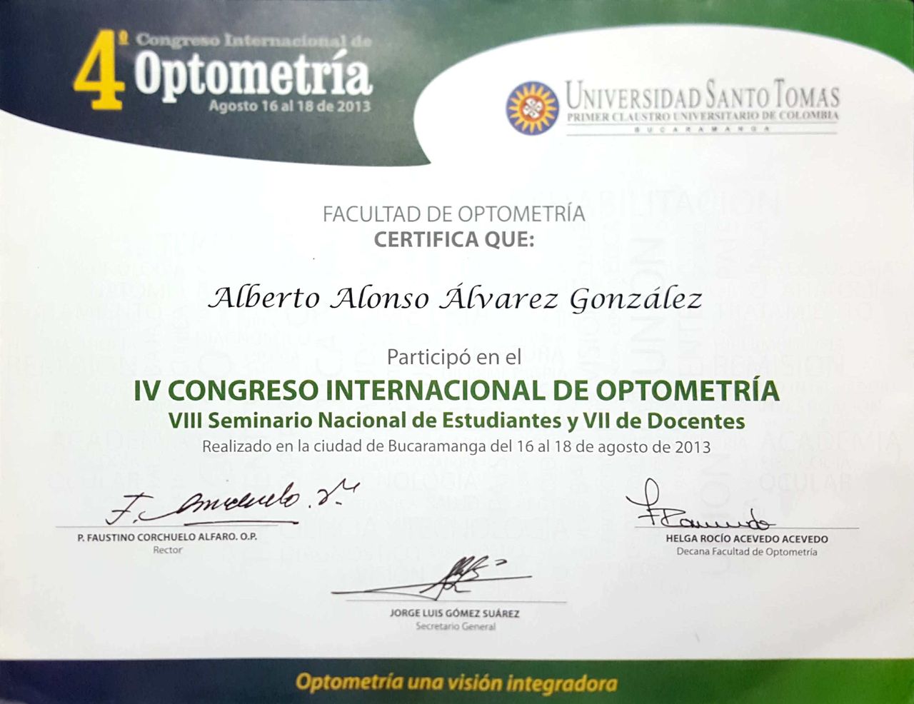 También he participado como conferencista en congresos nacionales e internacionales de optometría, donde he recibido reconocimientos por la calidad y el impacto de mis aportes. Algunos de estos eventos han sido respaldados por organizaciones como el World Council of Optometry, lo que ha fortalecido mi compromiso con el avance científico y profesional de la optometría.